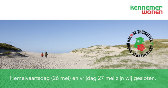 Hemelvaartsdag (26 mei) en vrijdag 27 mei zijn wij gesloten. Wij wensen u fijne dagen! U vindt veel informatie op onze website, en kunt zaken online regelen via kennemerwonen.nl. Voor spoedreparaties belt u naar (072) 8 222 888. U wordt dan doorverbonden naar onze meldkamer.