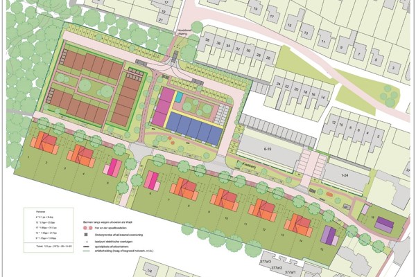 Bovenaan deze pagina ziet u een tekening van de nieuwe situatie. De sociale huurwoningen komen in het L vormige blauw/roze gebouw.