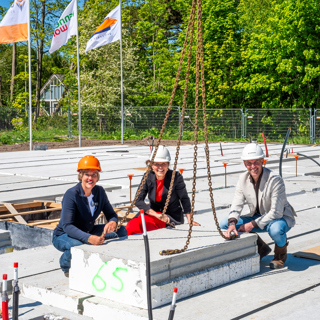 Op de locatie van Park de Beeck in Bergen, is de bouw van 120 huurwoningen van Kennemer Wonen zichtbaar op stoom. Om dit te vieren kwamen afgelopen vrijdag samenwerkingspartners, huurdersvertegenwoordigers en medewerkers samen op dit voormalig BSV-terrein. Onder toeziend oog van alle betrokkenen legden Krista Walter, directeur-bestuurder Kennemer Wonen, Yvonne Roos-Bakker, wethouder gemeente Bergen en David Wijnands, directeur Ouwehand Bouw Katwijk de laatste vloerplaat van het derde woonblok; een mijlpaal die symbool staat voor de voortgang én samenwerking bij dit project.