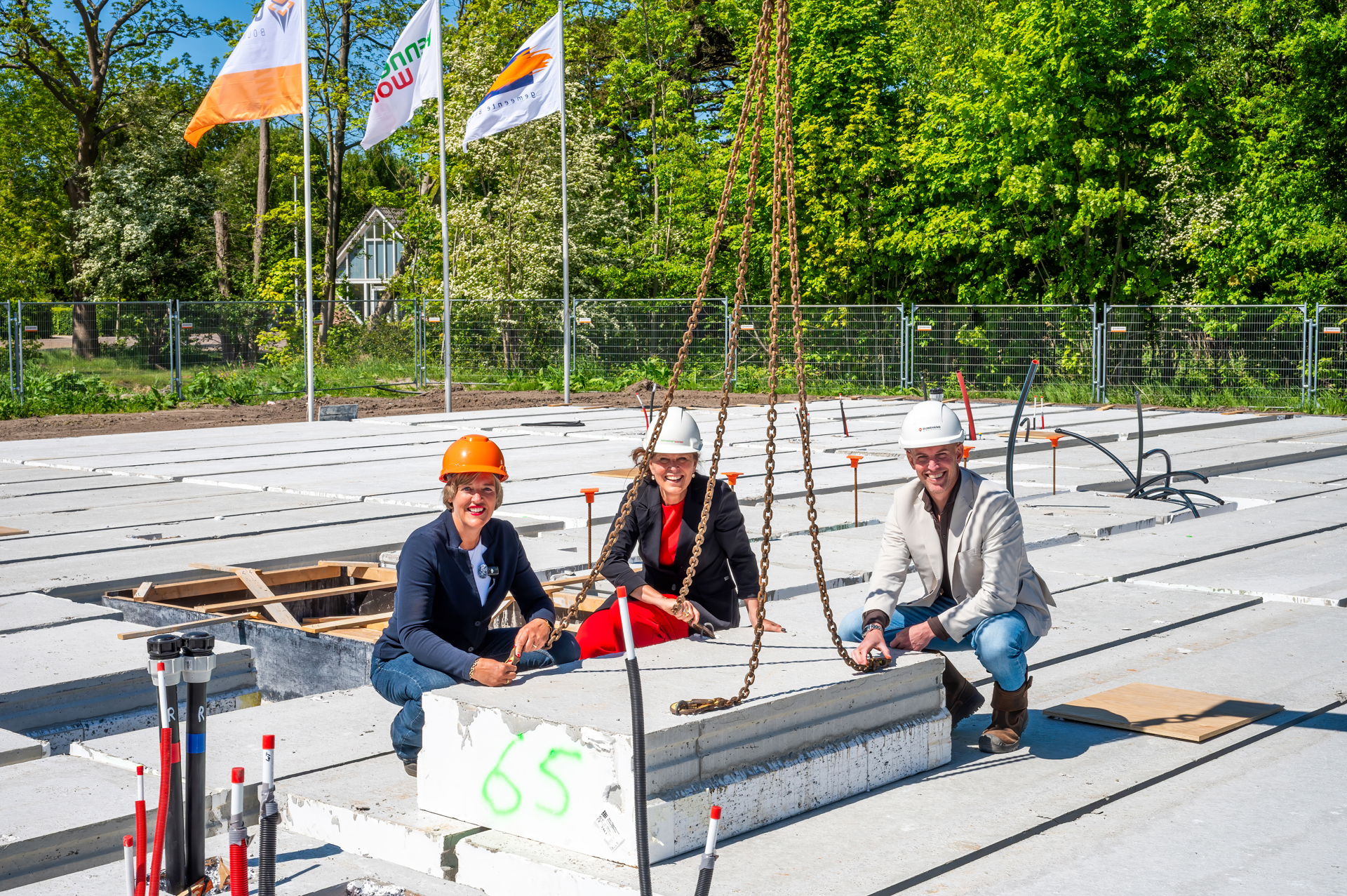 Vlnr: Yvonne Roos-Bakker, Krista Walter en David Wijnands bij de laatste vloerplaat van blok c.