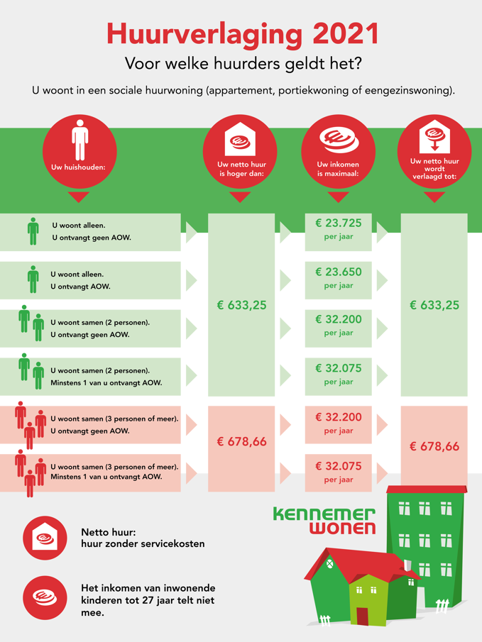 Of u in aanmerking komt voor de eenmalige huurverlaging in 2021 hangt af van: de hoogte van uw huur, uw inkomen en de samenstelling van uw huishouden. Deze gegevens ontvangen wij van de belastingdienst. De huurverlaging geldt alleen voor huurders van een sociale huurwoning bij een woningcorporatie. Voldoet u aan de voorwaarden, dan krijgt u in maart 2021 automatisch bericht van ons. Is uw netto huur lager dan €633,25? Dan komt u niet in aanmerking voor de eenmalige huurverlaging. In de afbeelding hieronder ziet u wat de voorwaarden zijn in verschillende situaties.