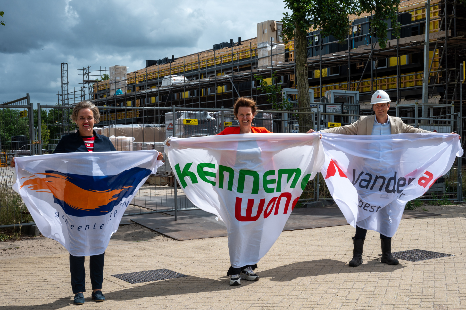 Het hoogste punt van de nieuwbouw van zestien sociale huurwoningen op de locatie van de voormalige Oosterkimschool in Schoorl is bereikt! Maandag 3 juli is dit op feestelijke wijze gevierd door Kennemer Wonen met omwonenden, huurdersorganisaties, gemeente en aannemer. De vlaggen zijn gehesen door Krista Walter, directeur-bestuurder Kennemer Wonen, Yvonne Roos-Bakker, wethouder gemeente Bergen en Koen van der Maat, directeur Bouwbedrijf Van der Gragt. Daarmee komt de oplevering van de zestien eengezinswoningen steeds dichterbij.