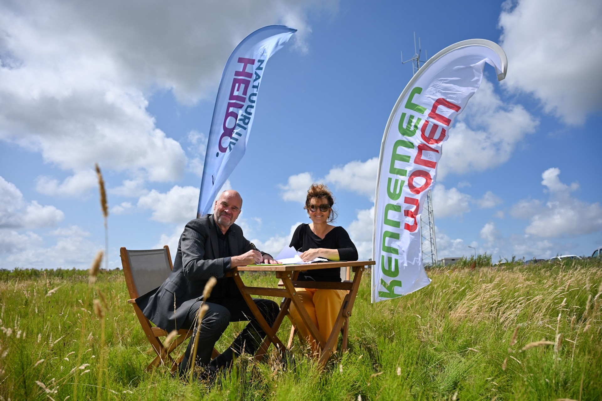 Ronald Vennik en Krista Walter ondertekenen de intentieovereenkomst op locatie aan de Lagelaan in Heiloo, één van de genoemde locaties in de overeenkomst.