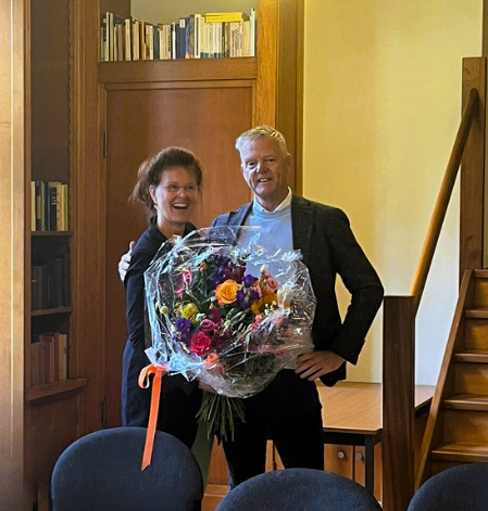"We hebben er alle vertrouwen in dat Krista op de ingezette koers verdergaat." Als blijk van waardering heeft John Pannekeet, namens de RvC, Krista een bloemetje aangeboden.