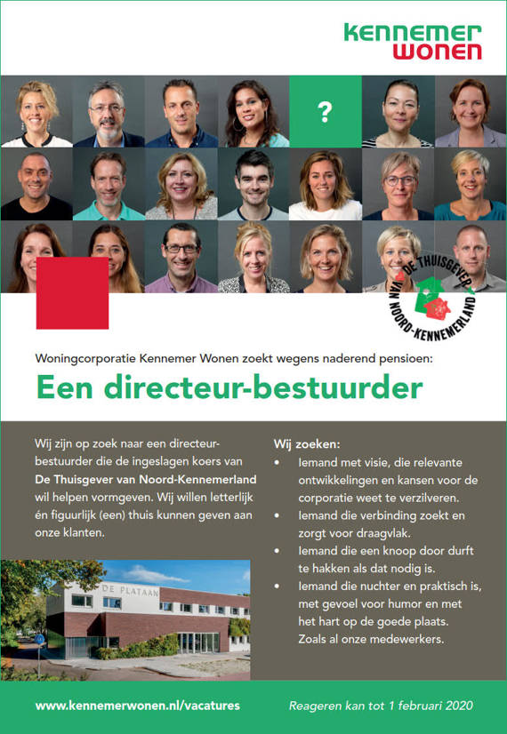 De huidige directeur-bestuurder Dick Tromp gaat dit jaar met pensioen, en daarom is de Raad van Commissarissen op zoek naar een directeur-bestuurder die de ingeslagen koers van De Thuisgever van Noord-Kennemerland wil helpen vormgeven. Kennemer Wonen wil letterlijk én figuurlijk (een) thuis kunnen geven aan onze klanten.