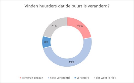 We vroegen huurders of zij vinden dat de buurt de afgelopen jaren is veranderd. De helft van de huurders vindt dat de buurt niet veranderd is. Een vijfde van de huurders vindt dat de buurt is achteruitgegaan. Zij zien dat de sociale verbinding minder wordt, ervaren meer overlast of vinden dat de buurt verloedert. Eén op de tien huurders vindt dat de buurt is verbeterd.